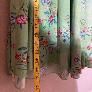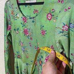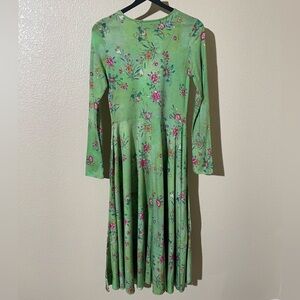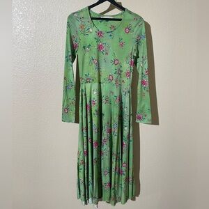 Charming green midi dress with floral pattern. Features long sleeves and a graceful flow. Ideal for versatile styling.