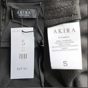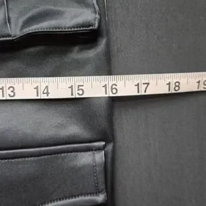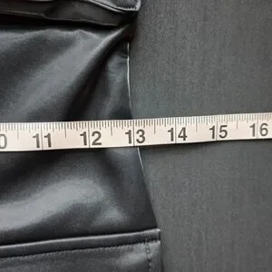 Lost Cargo Faux Leather Dress. It features a glossy faux leather construction,a midi length, a soft knit inner lining, a curve-hugging bodycon silhouette, a strapless neckline with inner elastic trim, six flap cargo pockets down the front, and silver back zipper closure. Please note the dress arrived with a few marks in the material as shown.