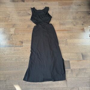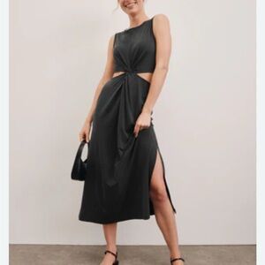 Chic charcoal midi dress with side cutouts. Sleeveless design. Perfect for versatile styling.
