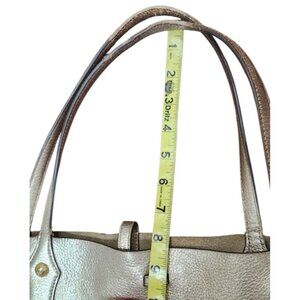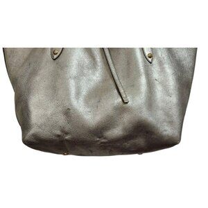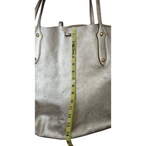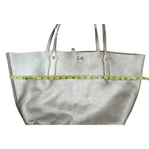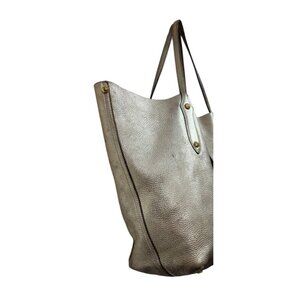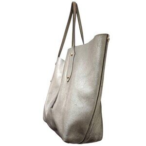 The Annabel Ingall Isabella Large Metallic Leather Tote is a stylish and spacious handbag designed for women. Made from pebbled leather with a metallic silver exterior, this rectangular tote features a zip closure, double leather handles, and gold hardware accents. The handbag also includes inner pockets for organization and a leather lining for durability. With a chic solid pattern and a trendy Isabella character, this tote exudes a sophisticated and fashion-forward style, perfect for everyday use or special occasions.