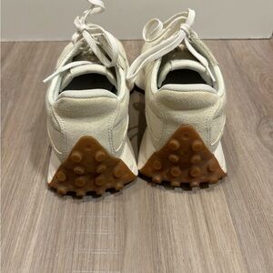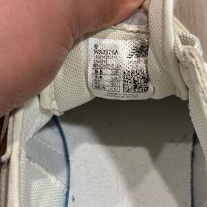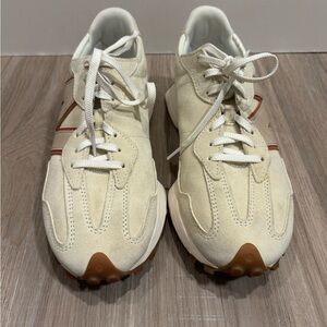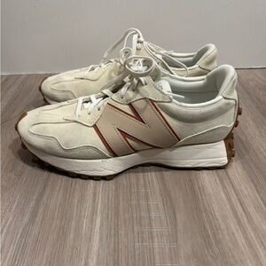 Stylish New Balance athletic shoes. Cream upper with tan accents. Comfortable and durable design.