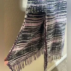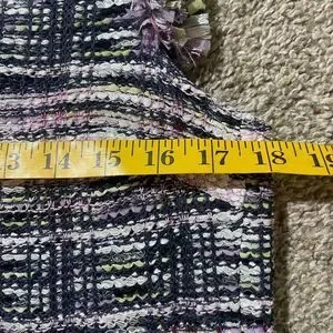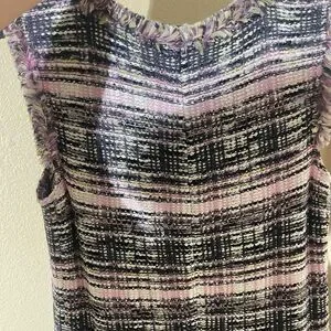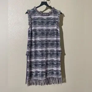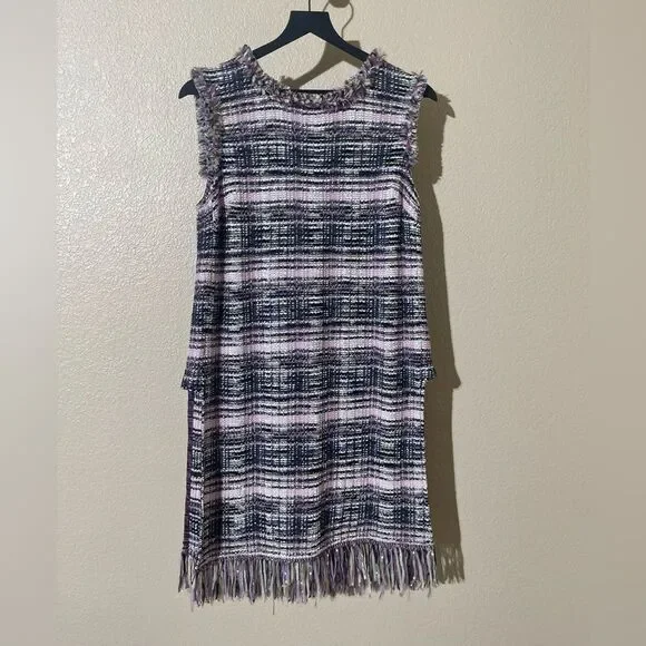 Elegant plaid midi dress. Features fringe details. Sleeveless design. Perfect for any occasion.