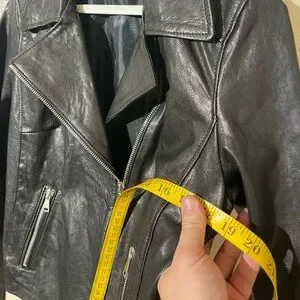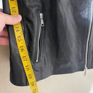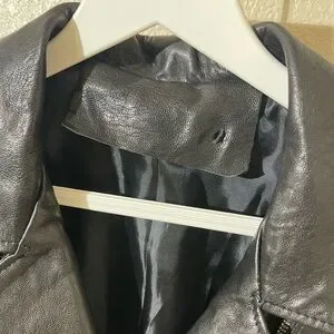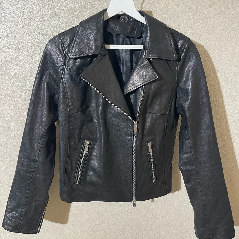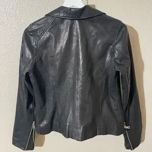 Chic black leather jacket with sleek design. Features zippered pockets and classic collar. Ideal for versatile styling.