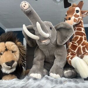 Soft and cuddly lion plush, Giraffe, and Elephant Realistic mane and features. Perfect for playtime and snuggles. Grandchildren are not a fan of stuffed animals. Gently used. All come with the signature FAO Schwarz stamp in the hip of each stuffed animal.