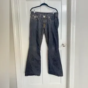 Iconic early 2000s True Religion low rise flare jeans with signature horseshoe back pockets and contrast stitching. The ultimate Y2K statement denim — perfect for baby tees, halters, and platform boots.