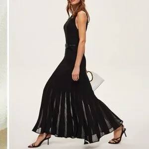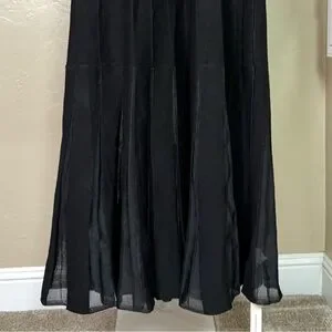 β’ Flared skirt with semi-sheer vertical panels.