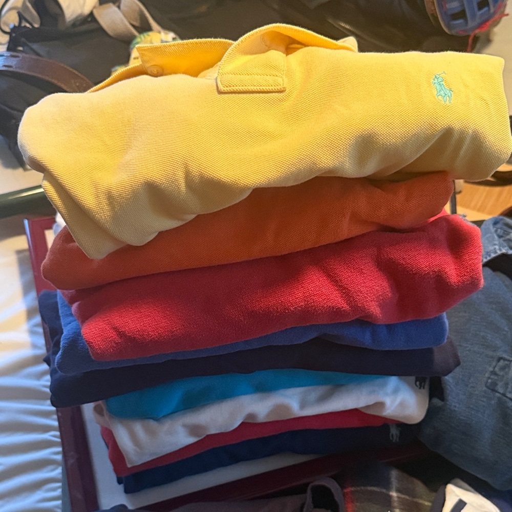 Vibrant collection of Polo by Ralph Lauren shirts. Includes yellow, orange, red, blue, and white polos. Perfect for casual wear.