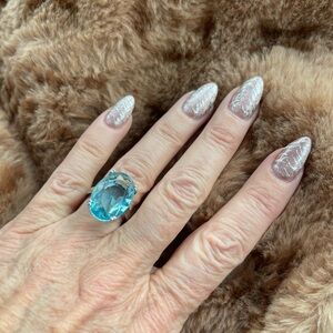 This stunning ring features a captivating blue topaz ( lab created) gemstone on sterling silver band. perfect for adding a touch of elegance to any outfit.this ring is a head turner. Size 5