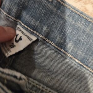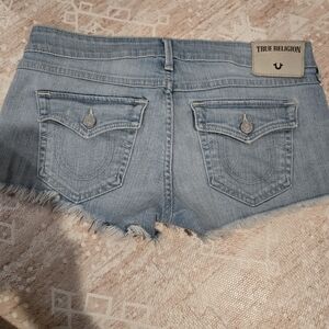 Chic light blue jean shorts with frayed edges. Ideal for casual wear.