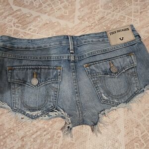 Chic distressed jean shorts with frayed edges. Ideal for casual wear.