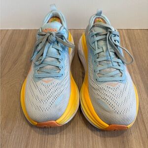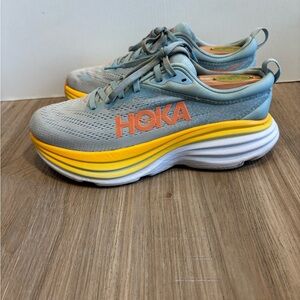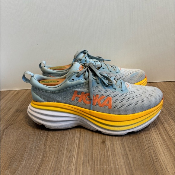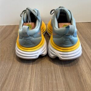Dynamic Hoka sneakers in light gray and vibrant yellow. Ideal for running and active lifestyles.
