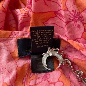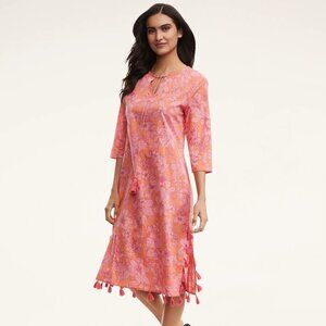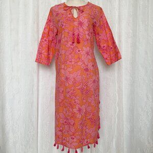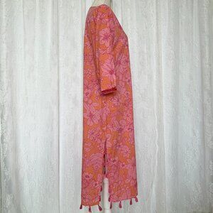 Brooks Brothers Women's Beach Coverup Pink Voile Floral Knee Length Pool Vacation Cruisewear Fringe Tassel Lightweight Breathable Slit Tie Keyhole Quarter Sleeve Batik Coastal Grandma