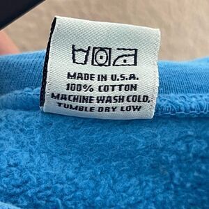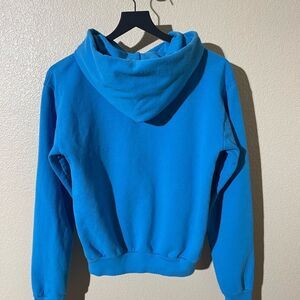 Vibrant blue hoodie with front pocket. Sporty & Rich logo on chest. Comfortable and stylish.