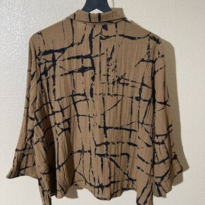 Chic button down shirt with abstract black pattern. Features stylish buttons and relaxed fit. Ideal for casual or formal wear.