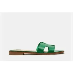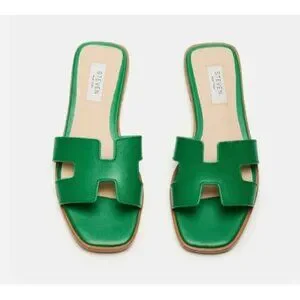 Steven New York sandals, green leather slides, H strap sandals, square toe slides, women’s summer shoes, slip-on sandals, green designer sandals, minimal leather slides, casual summer footwear, resort sandals, trendy sandals green