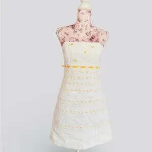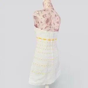 Chic strapless dress with a white base and yellow details. Ideal for a fresh, stylish look.
