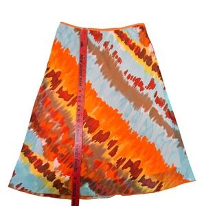Vintage Wrapper midi skirt featuring a bold abstract watercolor print in fiery red, orange, brown, and icy blue tones. Lightweight fabric with a soft flowy drape and subtle flounce hem. True 90s/Y2K statement piece, perfect for layering or summer styling.