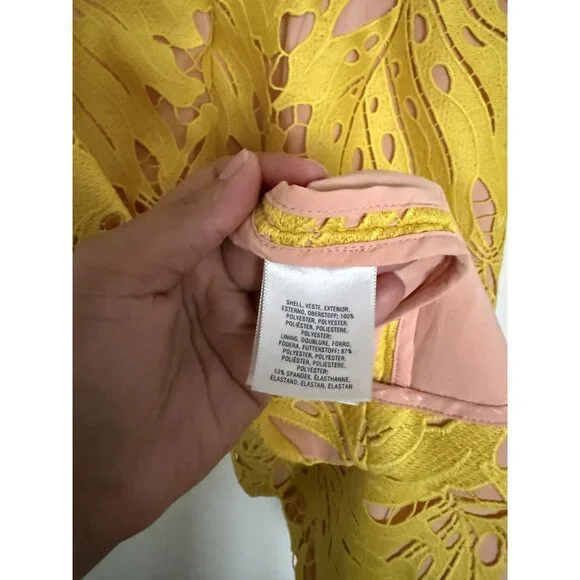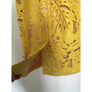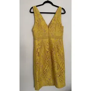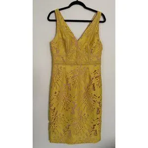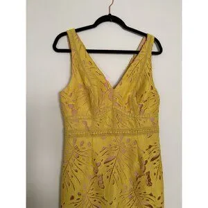 Excellent condition. Anthropologie Maeve Yellow Gardenia Crochet Lace Sleeveless Column Dress Size 10. Leaf design lace body. Stretchy lining