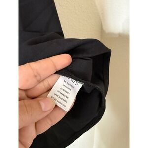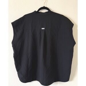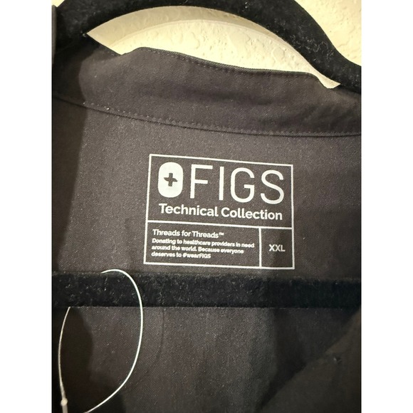 Excellent used condition. FIGS Technical Collection Rafaela scrub top in black. Oversized, sleeveless cap-sleeve cut. Features a sophisticated mandarin collar with a deep V-neckline and a subtle high-low hem for added coverage. Crafted from a durable, moisture-wicking blend with four-way stretch, it includes side seam pockets and a back box pleat. Length 28in pit to pit 28in.