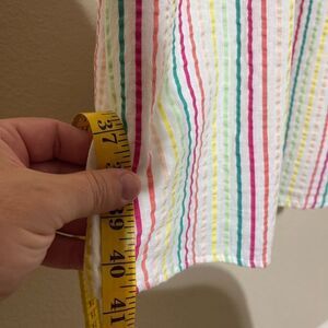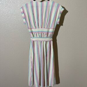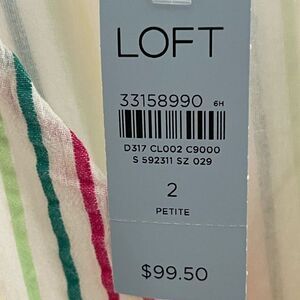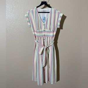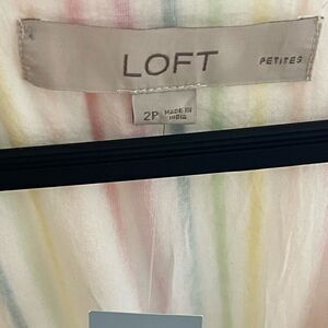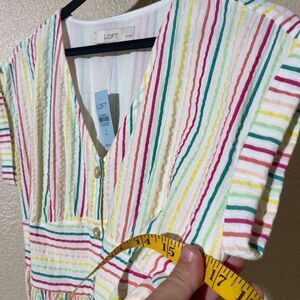 This sundress from LOFT features a charming v-neckline and flutter sleeves, perfect for casual or work settings. The buttoned front and tie waist add a touch of elegance, while the pink and blue hues offer a fresh, vibrant look. Its midi length and structured silhouette make it a versatile addition to any wardrobe.