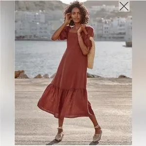 Embrace the softest side of linen in this romantic dress. Ready for day or date night, with a square neckline, empire waist, and a flounced hem, plus a comfy smocked back panel for pullover ease and an effortless fit.