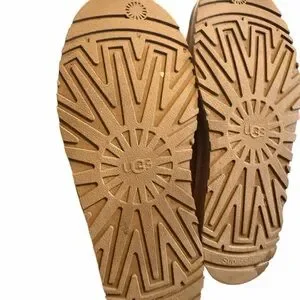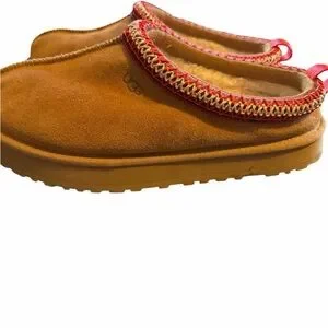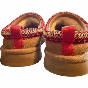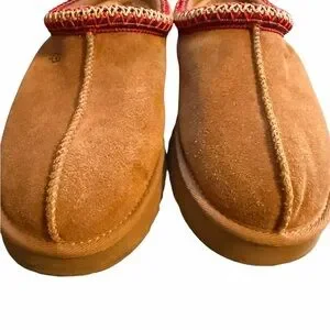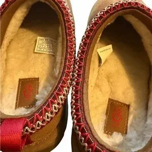 Stylish UGG slippers in tan suede. Features a red accent for a pop of color. Ideal for cozy wear.