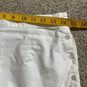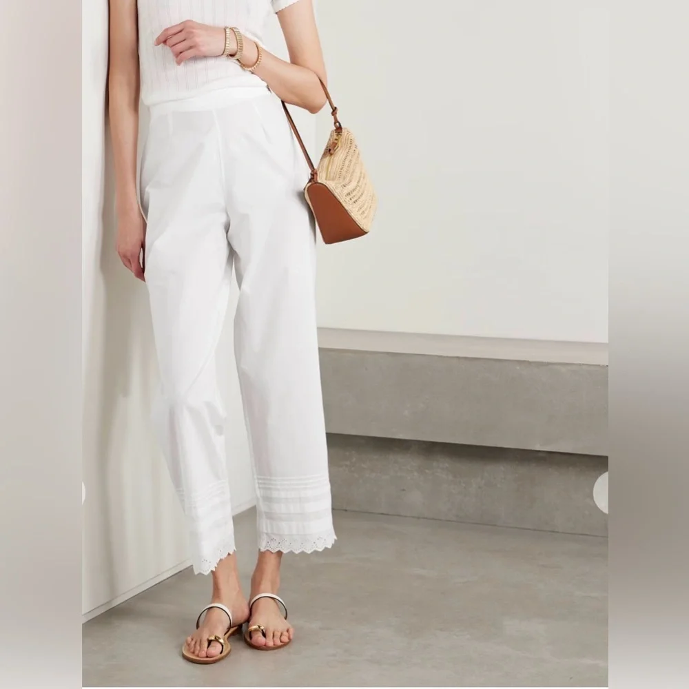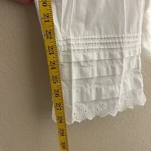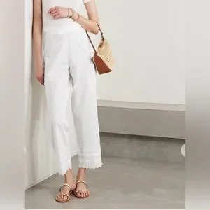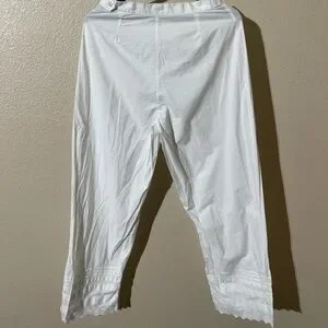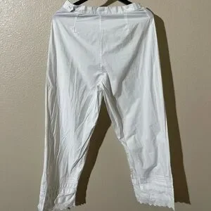 Elegant white cropped pants. Features delicate lace trim. Perfect for casual or dressy occasions.