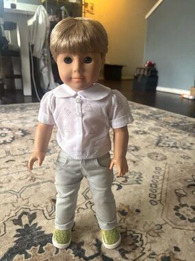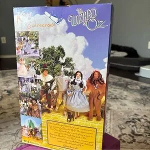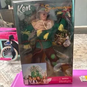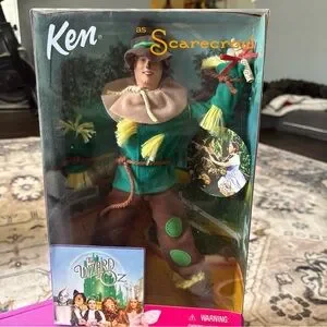 Ken doll dressed as Scarecrow from The Wizard of Oz. Features green and brown outfit with yellow accents.