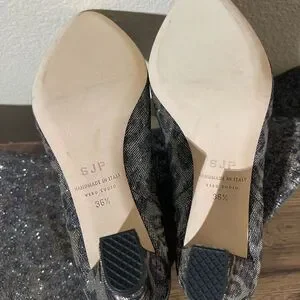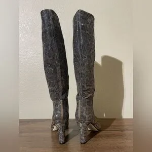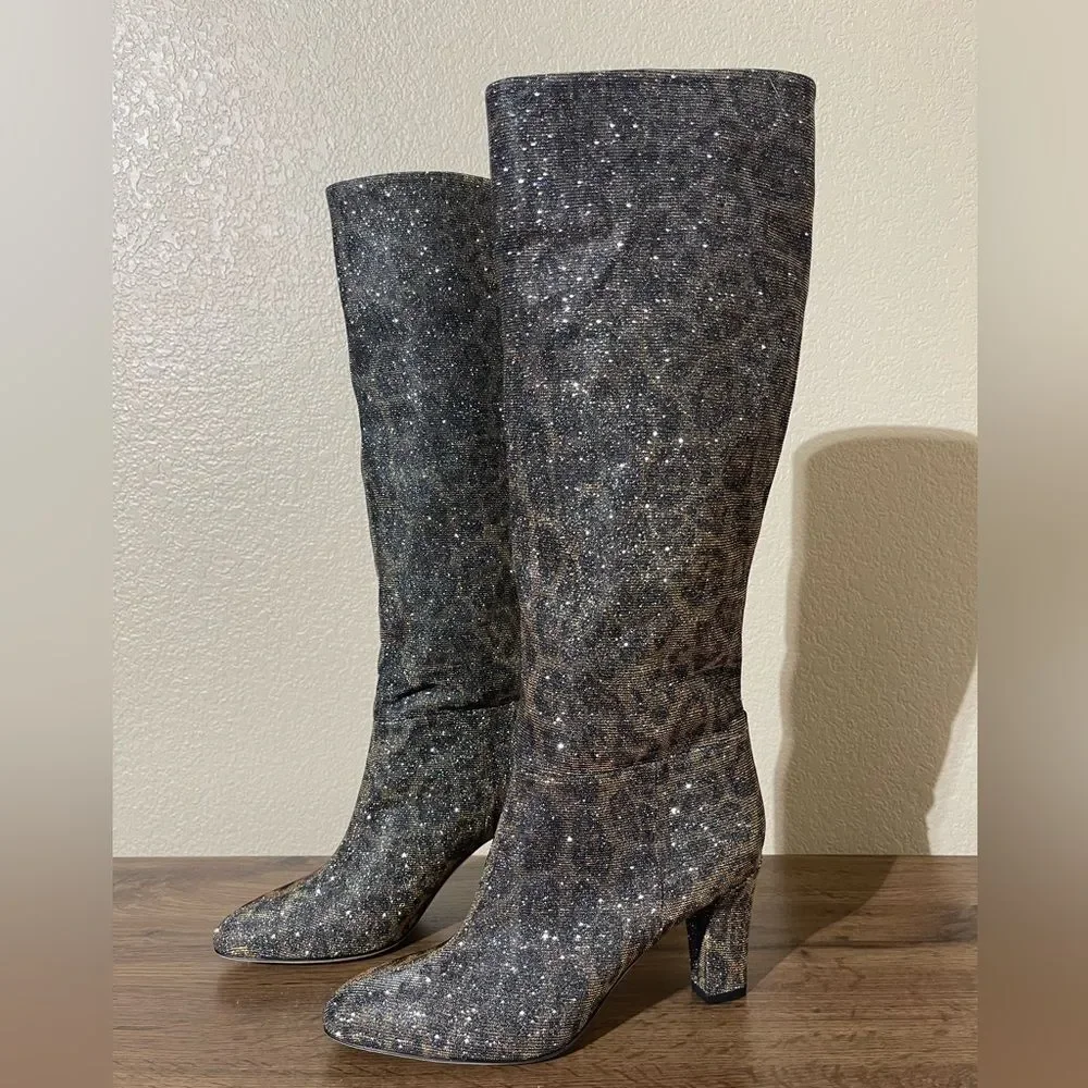 Step out in style with these elegant glitter knee-high boots. Perfect for adding a touch of sparkle to any outfit.