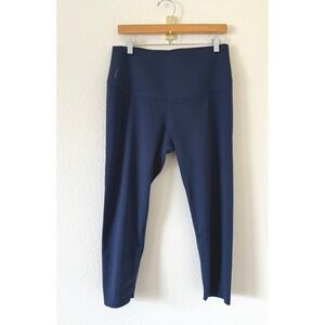 Great used condition. High-waisted compression leggings in a sleek blue finish, featuring innovative velvet-textured geometric flocking that provides targeted muscle support and a unique visual aesthetic. The wide waistband offers a secure, stay-put fit during high-intensity workouts, while the moisture-wicking fabric ensures breathability. Tummy control compression. Contour-enhancing tonal stripe detailing. Note: There is a small paint marks as shown in photos. Rise is 13in, inseam 22in, waist 15in
