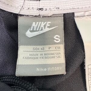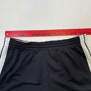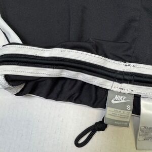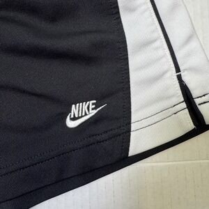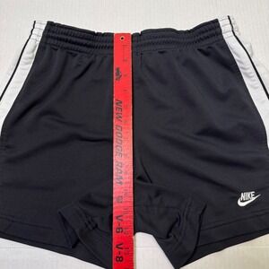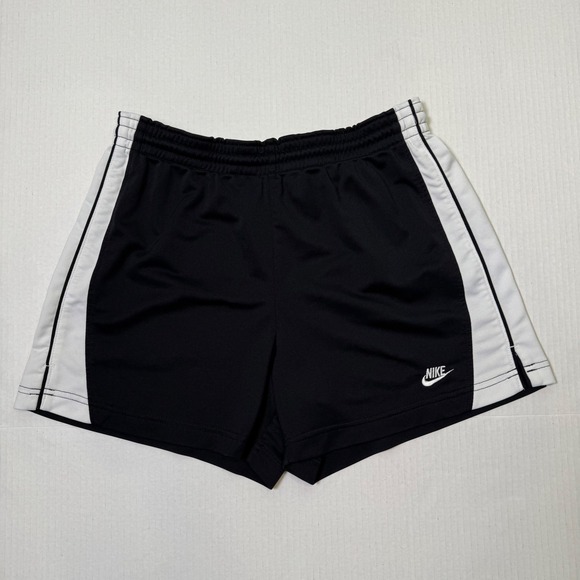 Classic black Nike athletic shorts with white side panels and embroidered swoosh logo. Elastic waistband for a comfortable fit. Lightweight and perfect for workouts, running, or casual athleisure wear.