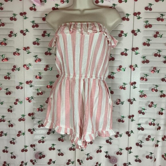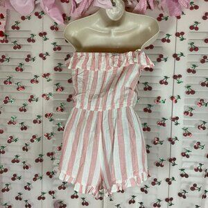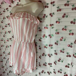 Pink and white striped strapless romper with ruffle trim #festival #summer