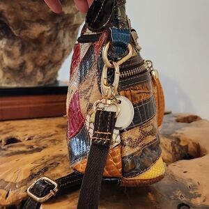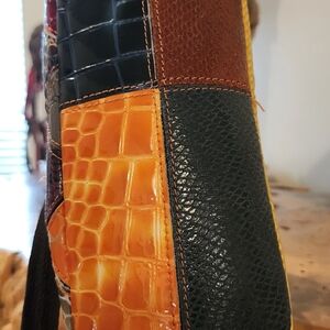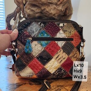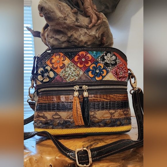 This vibrant crossbody bag features a stunning multicolor floral patchwork design. Perfect for adding a pop of color to any outfit. genuine leather