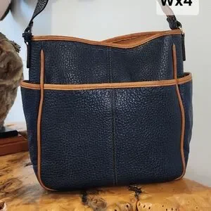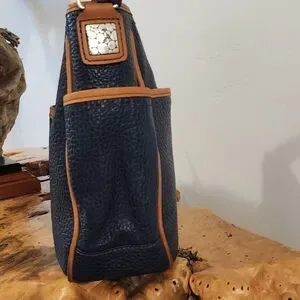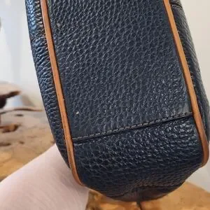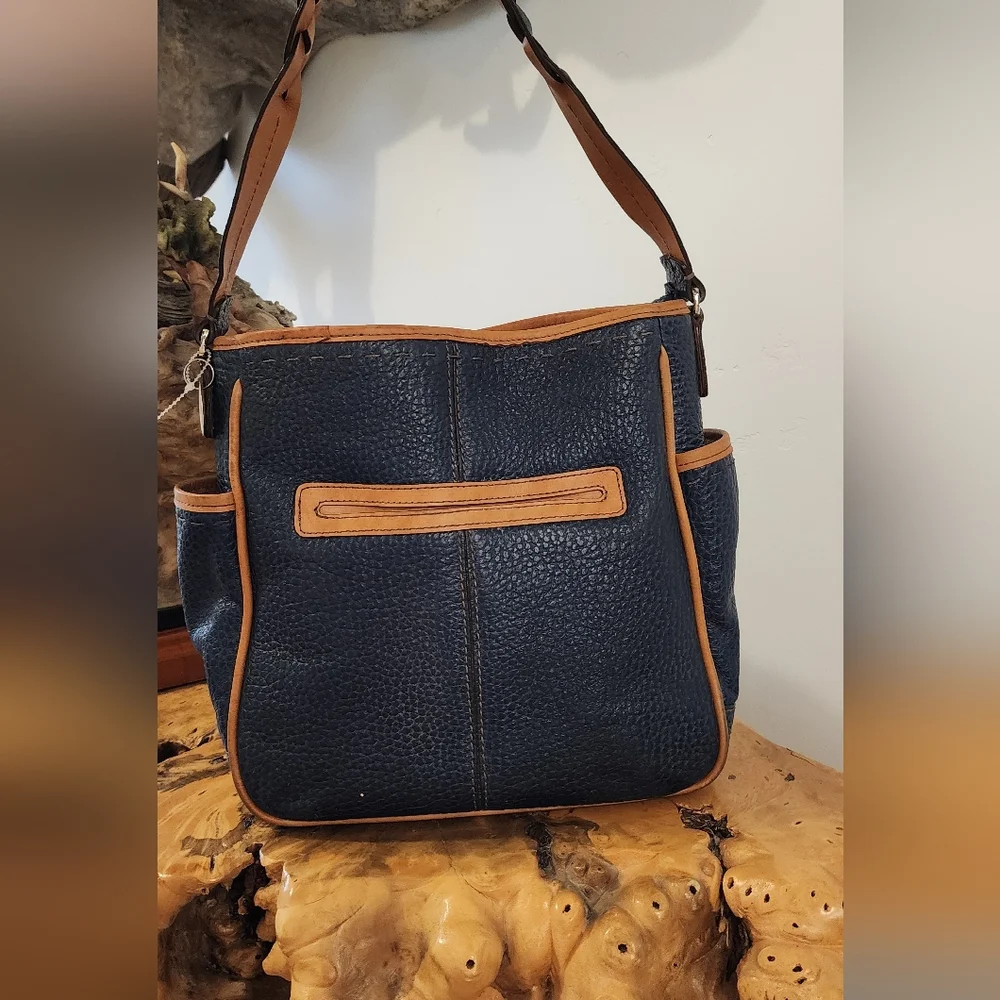 Sophisticated shoulder bag with navy body and tan accents. Ideal for daily use.