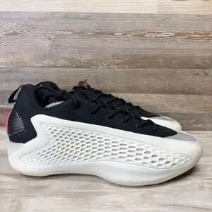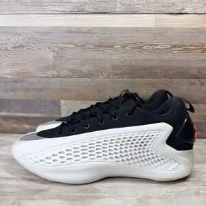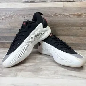 Adidas Anthony Edwards 1 Low AE1 basketball shoes in the Arctic Fusion colorway feature a striking honeycomb TPU cage for lateral stability and Light Boost cushioning for explosive energy return. The breathable black textile upper is complemented by a silver reflective toe box and bold red branding on the carbon fiber-textured heel counter. Designed for high-performance play, these low-top sneakers offer a secure fit with a traditional lacing system and a durable rubber outsole for superior traction on the court.