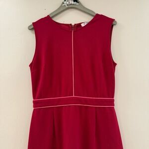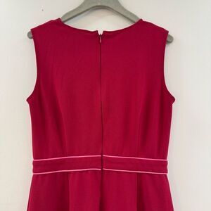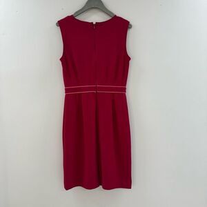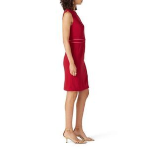 Red crepe (100% Polyester). Sheath. Sleeveless. Crew neckline. Hidden back zipper closure. Fully lined. 37" from shoulder to hemline.