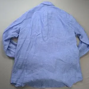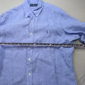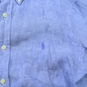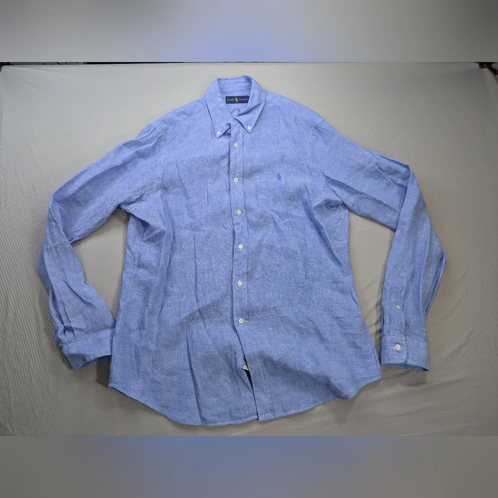 Stylish light blue button-down shirt. Features classic Polo design. Ideal for casual wear.