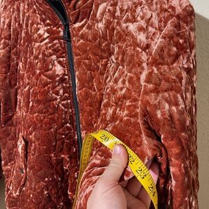 Elegant velvet bomber jacket in rich rust. Features quilted design and ribbed cuffs. Ideal for cooler days.