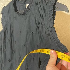 This elegant black mini dress features a charming eyelet design, perfect for any occasion. Its sleeveless style offers a chic and modern look.