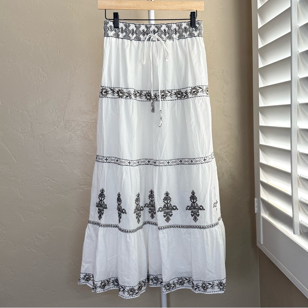 Lightweight white skirt with black and gold embroidery detailing and a relaxed boho silhouette.