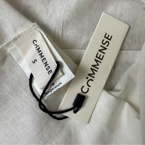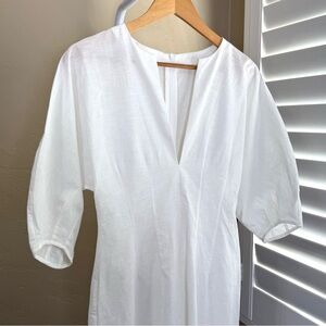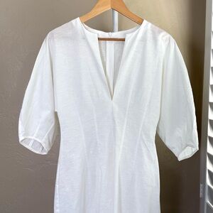 Commense white linen blend midi dress, new with tags. Features a clean minimalist silhouette with flattering vertical seams, soft puff sleeves, and a subtle V neckline.