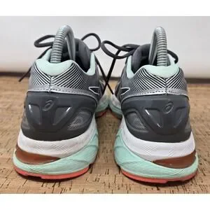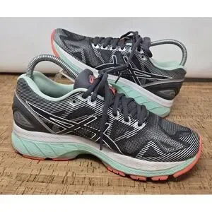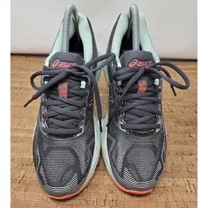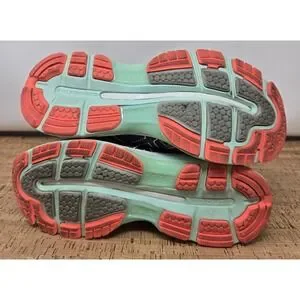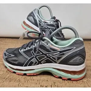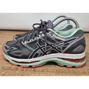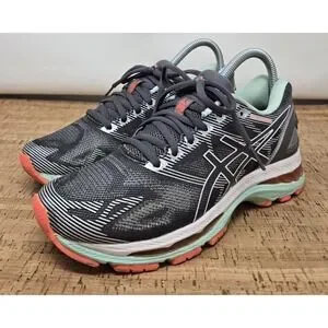The Asics Gel Nimbus 19 Running Shoes for women in size 7 feature a carbon, white, and flash coral color scheme with a geometric pattern. These athletic shoes are designed for running and cross training, with features like reflective accents, breathable construction, and water-resistant capabilities. The lace-up closure, rubber outsole, and foam insole provide comfort and support for your feet during your active pursuits. With the ASICS brand's signature performance and quality, these Gel Nimbus 19 shoes are a stylish and functional choice for women looking for reliable athletic footwear.