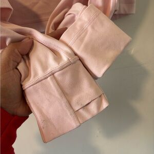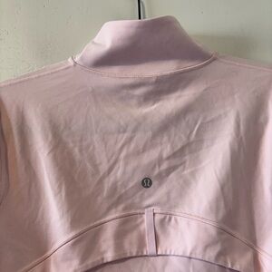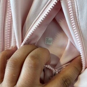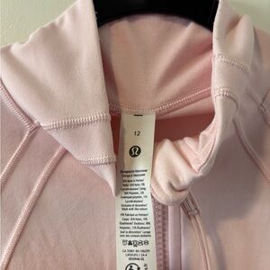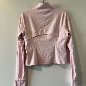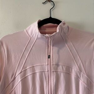 Light pink zip-up jacket with a stand collar. Features front zip pockets and a full-length zipper. Streamlined seam details for a fitted look. Lightweight and versatile for layering.
