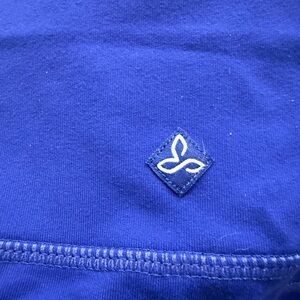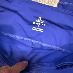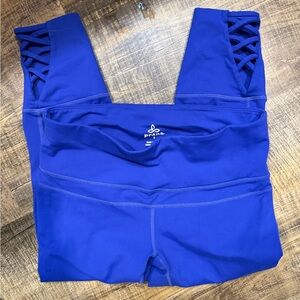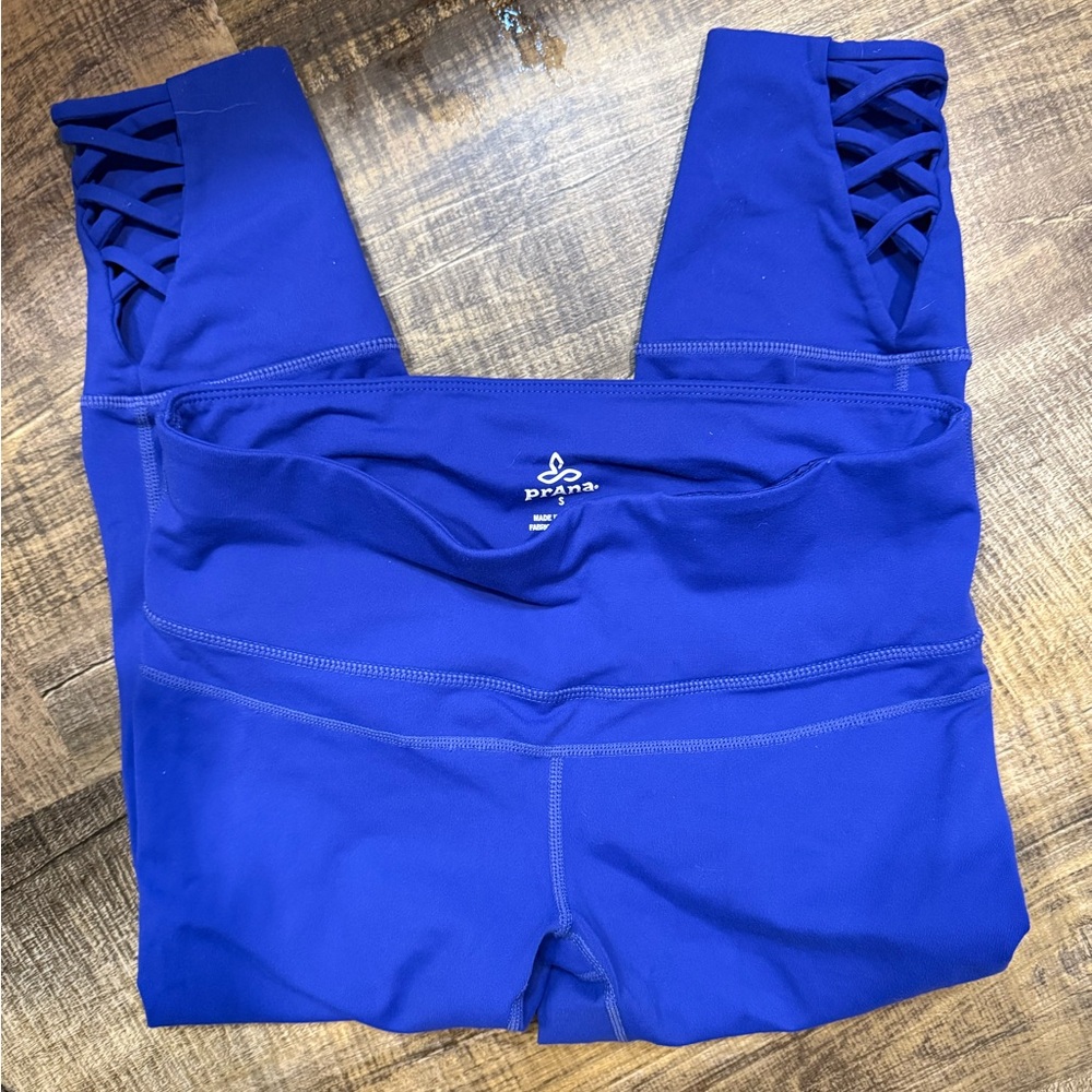 High-rise active leggings with decorative lattice straps at the hips. Smooth, stretchy fabric for movement and comfort. Prana logo at the waistband. Versatile for studio or everyday wear.