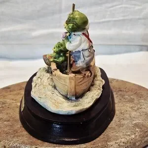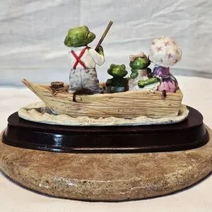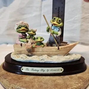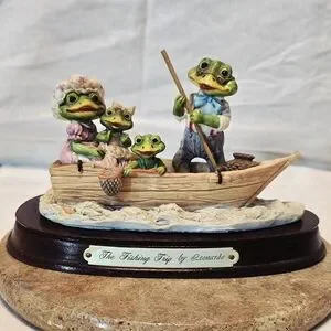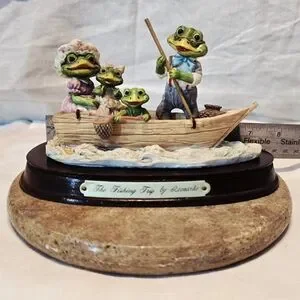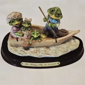 Add a touch of whimsical 1980s nostalgia to your collection with this charming Little Nook Village figurine titled "The Fishing Trip." Designed by Leonardo and licensed by The Heritage Mint, Ltd., this piece features an adorable anthropomorphic frog family enjoying a day out on the water.