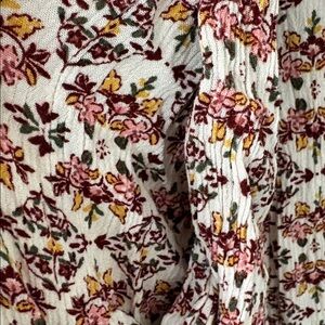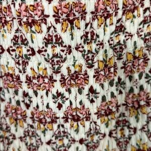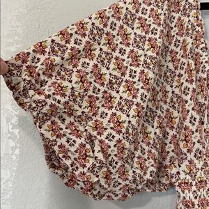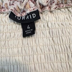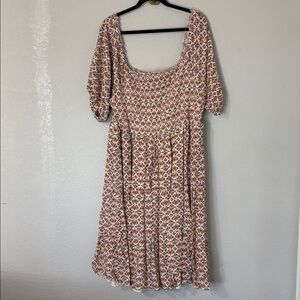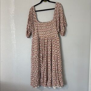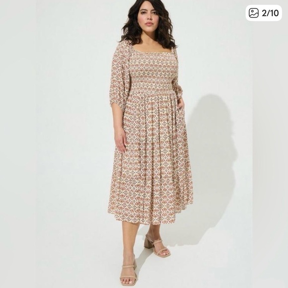 Torrid Midi Tiered Cream Floral Dress Ruched 4X. Lined. Has pockets. Bodice is ruched so has stretch. Square neck. Red pink yellow and green ditzy floral pattern
