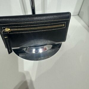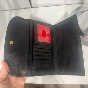 Chic black wallet with gold-tone logo. Compact and stylish design.