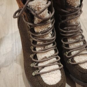 Stylish brown lace-up ankle boots with cozy faux-shearling trim. Chunky block heel and lug sole provide stable, all-day comfort. Soft fabric upper and ribbed ankle collar offer a snug, fashionable fit. Ideal for casual fall and winter looks.