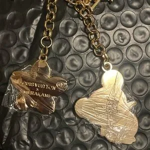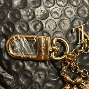 Luxurious Louis Vuitton keychain, Upcycled Charms. Gold-tone chain with LV logo and floral motif. Pink enamel flower with red center accent. Colorful multicolor bear charm adds playful contrast. Attaches easily to bags or keys for a designer touch.