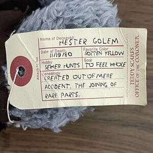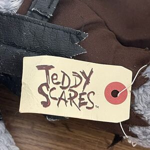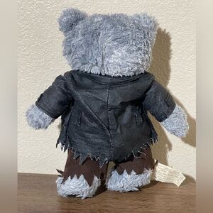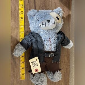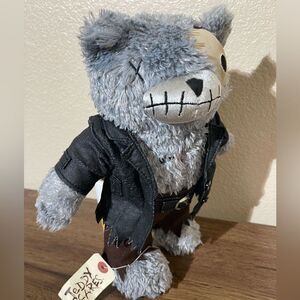 Discover the unique charm of the plush toy. This gray teddy bear features a distinctive design with a stitched face and a rugged outfit. Perfect for kids who love quirky and fun toys.